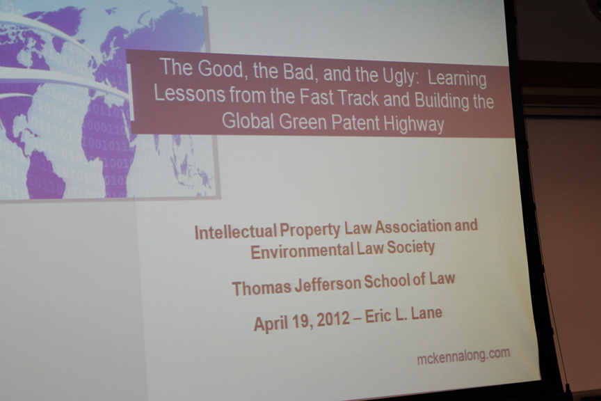 The presentation titled “Where Green Meets Tech – The Intersection of Environmental Law and Intellectual Property” was a huge success. Lane compared and contrasted the various green technology fast track programs throughout the world. He broke the programs down into what he termed ‘The Good, The Bad and The Ugly”. Lane concluded with his ideal for a worldwide fast track program which would harmonize each individual nations program, provide certainty in the market place, and eventually lead to more issued patents in the green tech sector. Lane finished with an informative question and discussion session. All in attendance were quite impressed and thoroughly enjoyed the talk. Lane will be teaching a seminar course in Green Technology here at Thomas Jefferson next fall. If you are interested in the field, you should register for what is sure to be a great course.
